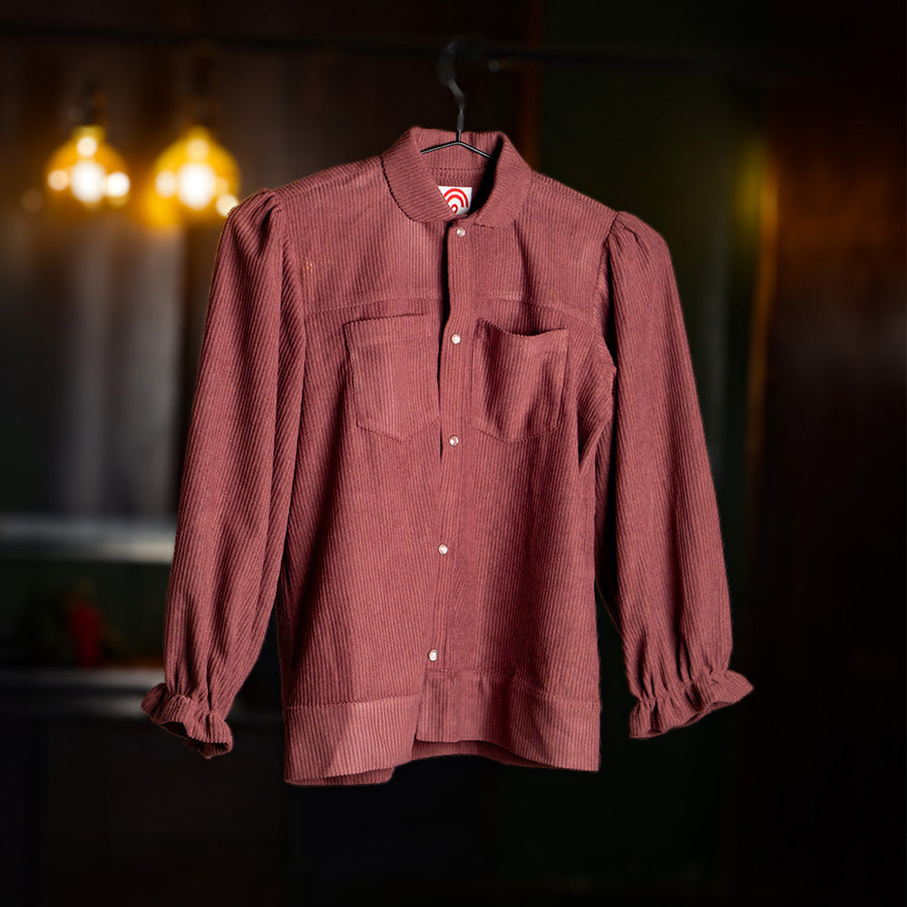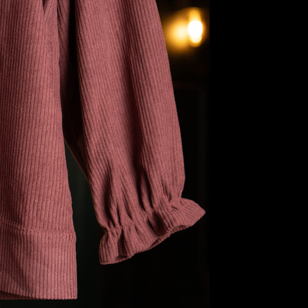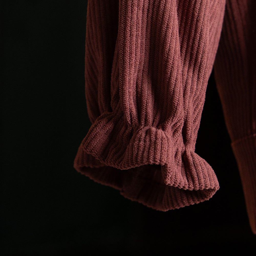 Introducing "Rouge Ruffles," a delightful top for girls that blends retro style with a touch of whimsy. Made from soft corduroy, this top features charming ruffles at the end of the sleeves, adding a playful and stylish detail to any outfit. Perfect for young fashionistas who love to stand out in classic, cozy comfort.